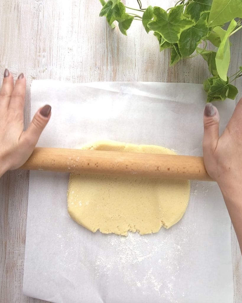 Sobald alles kompakt ist, auf die Arbeitsfläche übertragen und bearbeiten, bis ein weicher und kompakter Teig entsteht. Den Teigling halbieren und in Frischhaltefolie wickeln, eine Stunde im Kühlschrank ruhen lassen.