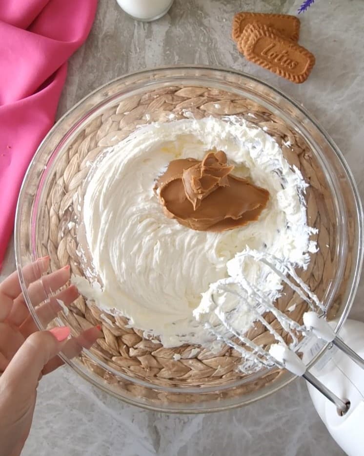 Geben Sie in eine Schüssel den Mascarpone, Zucker und Lotus-Creme, dann mit einem Mixer verrühren.