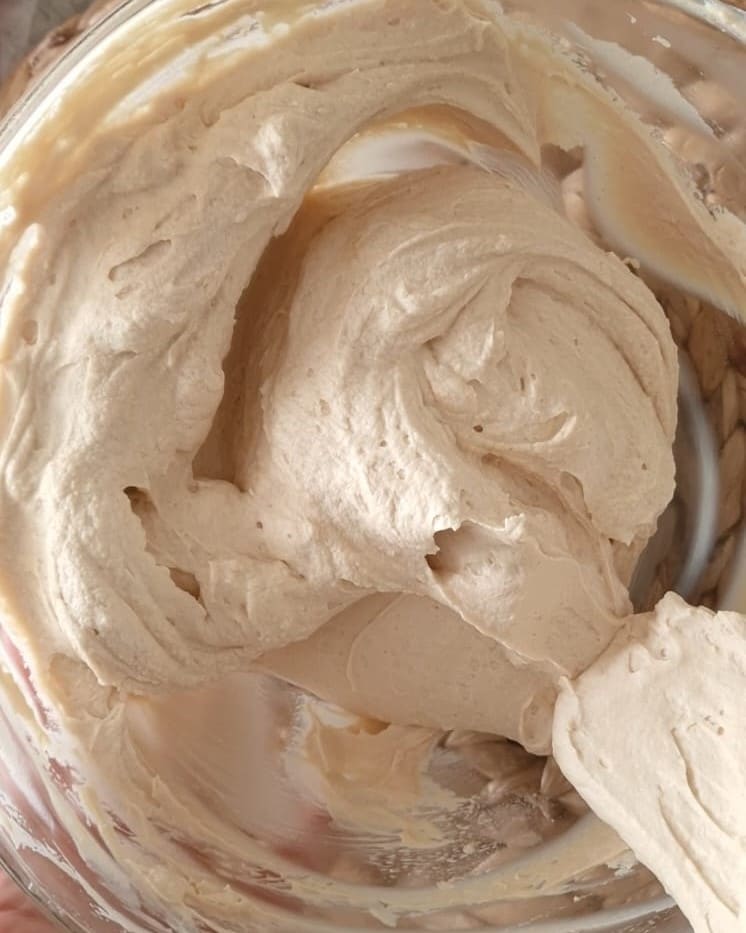 Sie sollten eine glatte Creme ohne Klumpen erhalten, dann die bereits geschlagene Sahne hinzufügen und von unten nach oben rühren, ohne die Mischung zu entlüften.