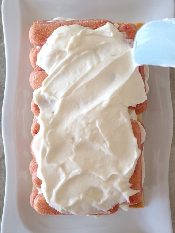 Mit einem Spatel die gesamte Oberfläche gut bedecken.Die Löffelbiskuits im Alchermes tränken und auf die Creme legen, eine weitere Schicht machen und dann mit der Blätterteigscheibe abschließen.