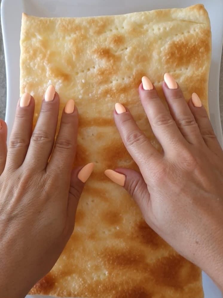 Beginnen Sie mit dem Ausrollen des Blätterteigs und teilen Sie ihn dann in zwei Hälften auf der Längsseite.