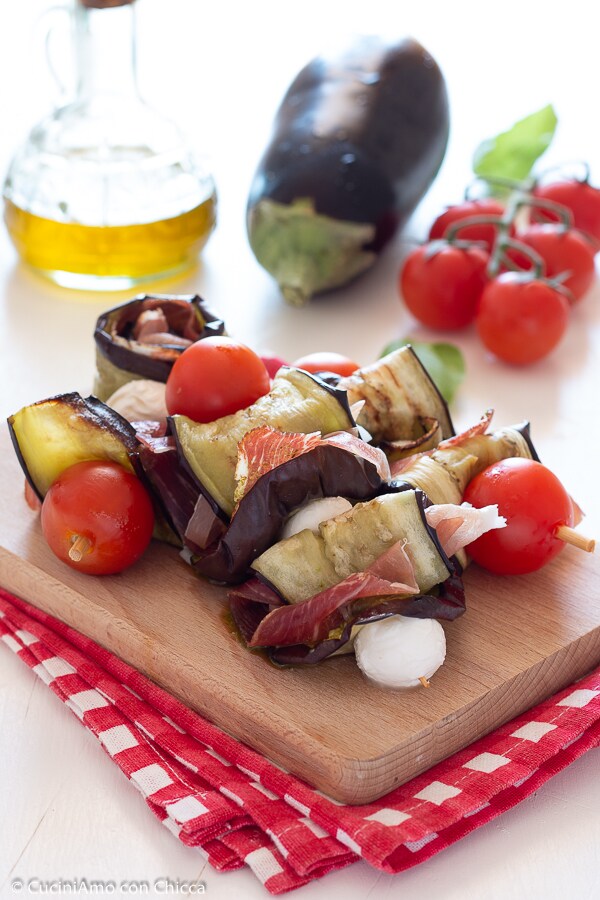 Einfache und schnelle gegrillte Auberginenspieße, das Rezept ist perfekt, um es im Voraus zuzubereiten, ideal für ein Sommerabendessen. Es handelt sich um gegrillte Auberginen, angereichert mit einer köstlichen Füllung aus Basilikumpesto und Speck, das Ganze auf einem Holzstab als Spieß montiert.
