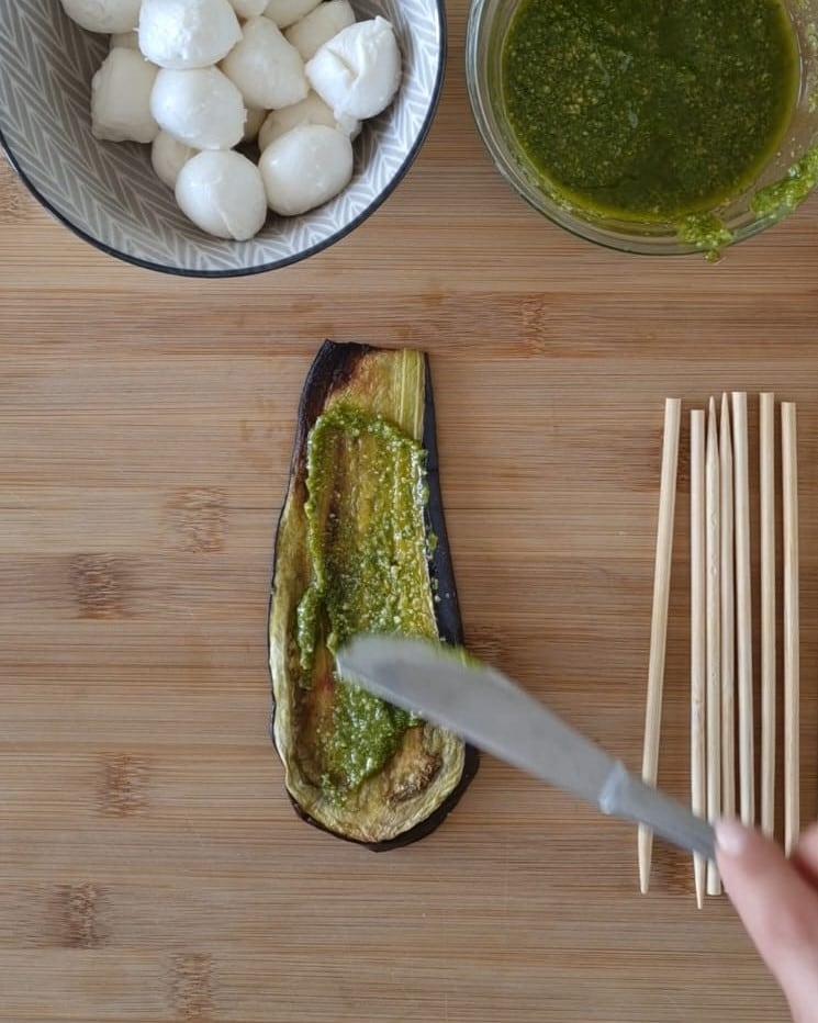 Die Spieße können bis zum nächsten Tag im Kühlschrank aufbewahrt werden. Wenn Sie kein Basilikumpesto mögen, können Sie Pistazienpesto verwenden, oder es durch einen cremigen Käse wie Philadelphia oder Stracchino ersetzen.