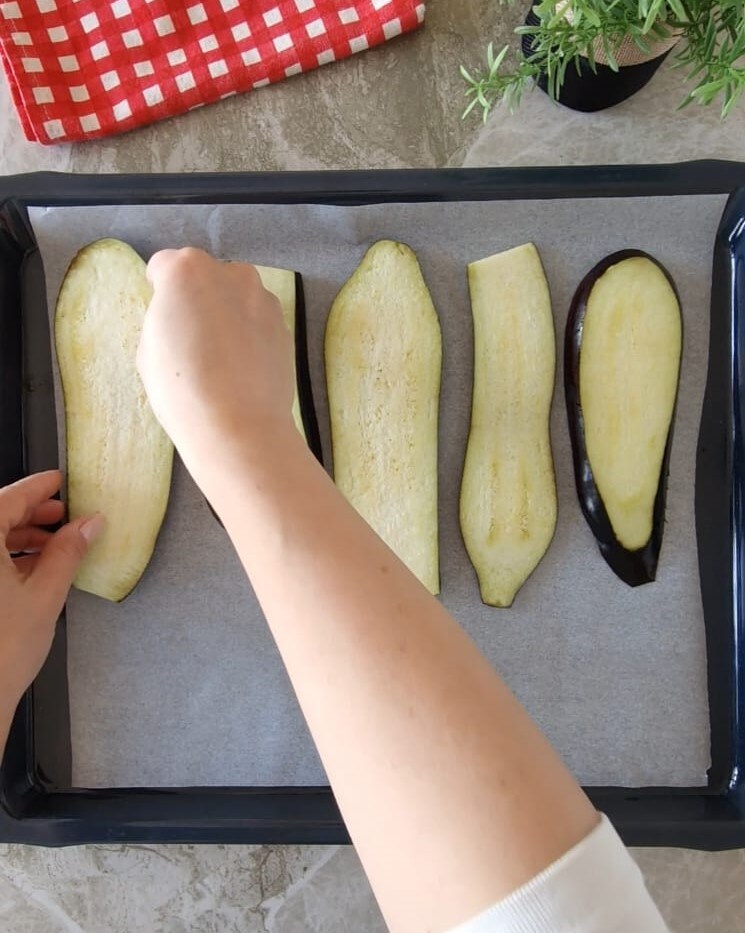 Fahren Sie fort, indem Sie die Auberginen im Ofen bei 200°C etwa 10 Minuten oder bis zur Bräunung backen.