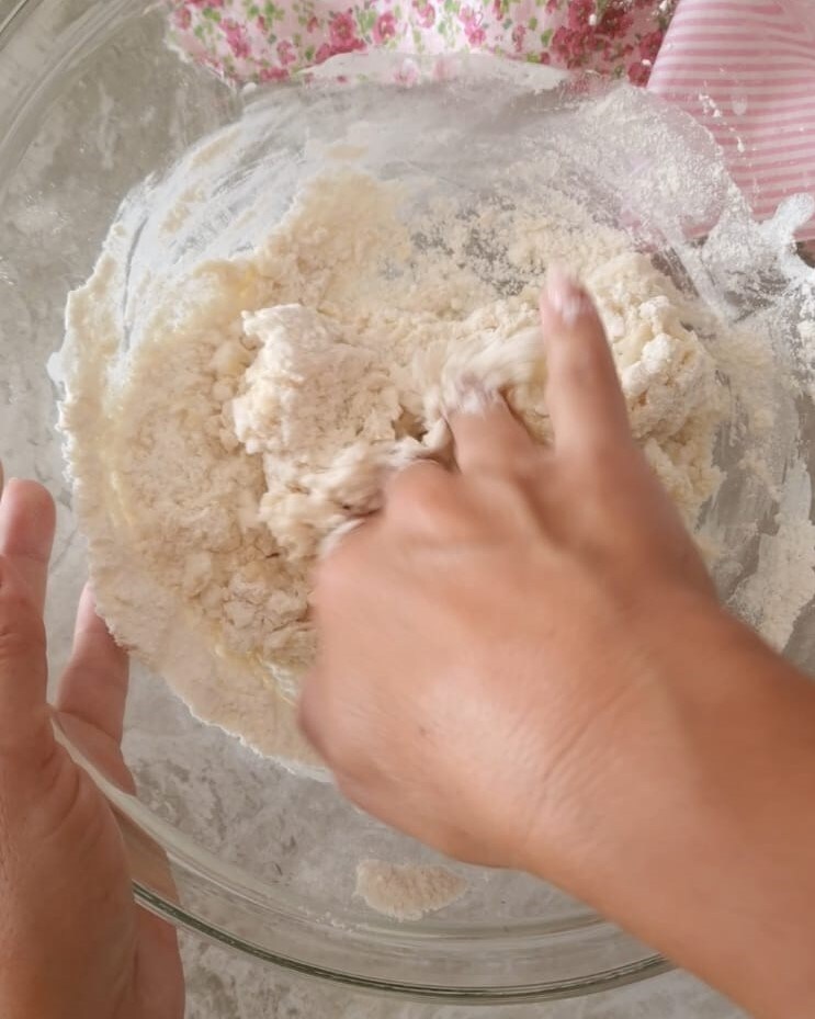 Gießen Sie die Milch und das Öl dazu, dann beginnen Sie zu kneten, zuerst mit der Gabel und dann mit den Händen.