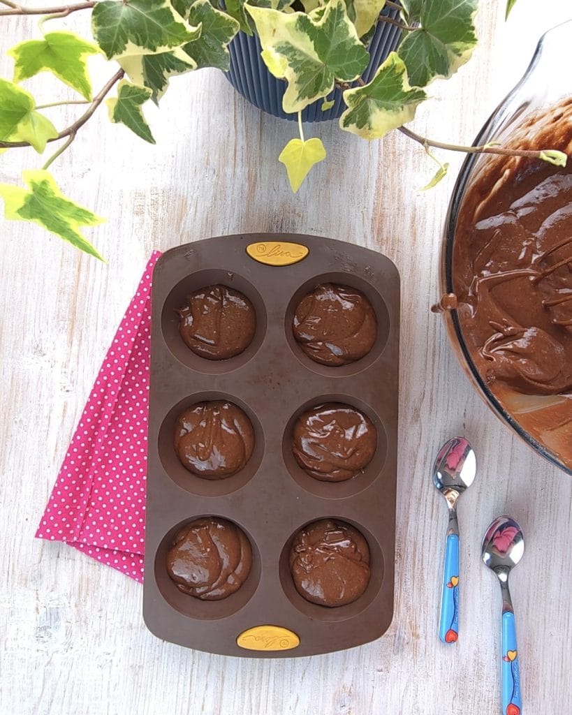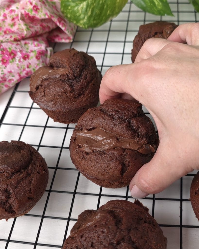 Fügen Sie die Nutella mit Hilfe von zwei Löffeln hinzu und backen Sie sie dann bei 170°C für etwa 20 Minuten im Ofen. Machen Sie immer die Stäbchenprobe (natürlich dort, wo Sie keine Nutella hinzugefügt haben). Wenn Sie sehen, dass sie zu dunkel werden, decken Sie sie in den letzten 10 Minuten der Backzeit mit einem Blatt Alufolie ab.