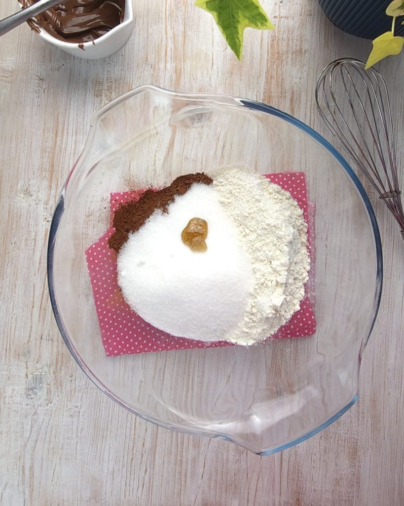 Beginnen Sie damit, das Mehl, das Backpulver, den Zucker und das Kakaopulver in eine Schüssel zu geben und gut mit einem Schneebesen zu vermischen.