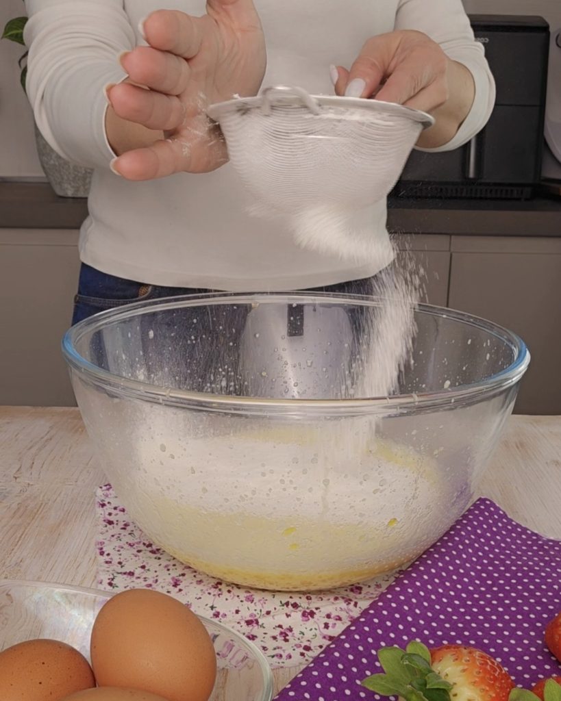Jetzt das zuvor gesiebte Mehl und Backpulver unterheben; zum Schluss die in kleine Stücke geschnittenen Erdbeeren und die Schokotropfen unterrühren.