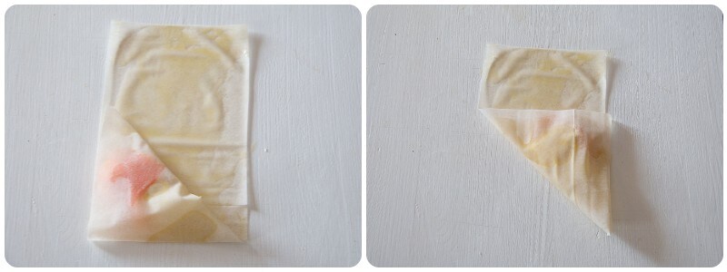 Rollen Sie den Filoteig aus und teilen Sie ihn dann in zwei Teile auf der langen Seite; anschließend die gesamte Oberfläche mit Olivenöl bestreichen. Danach mit Ricotta-Creme und einer Scheibe Lachs die untere Ecke jeder Streifen belegen. Nun die Füllung von der unteren Ecke des Teigs aus beginnen, zu einem Dreieck formen. Falten Sie das Dreieck abwechselnd weiter, bis der Streifen endet.