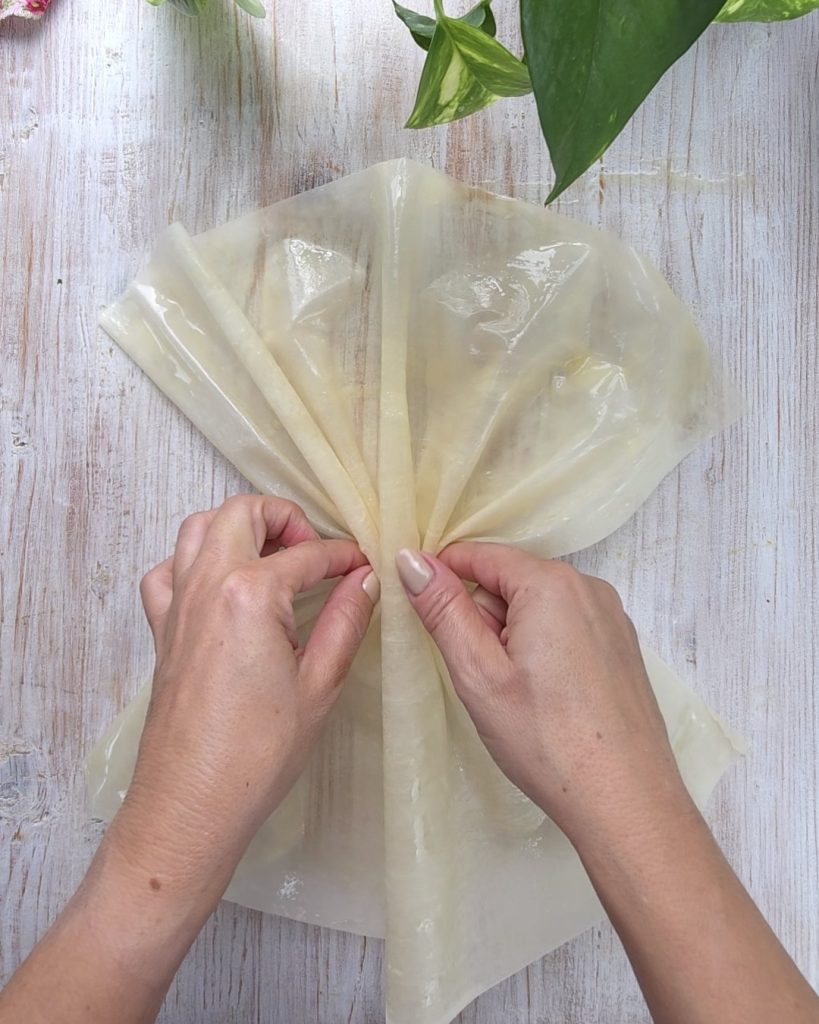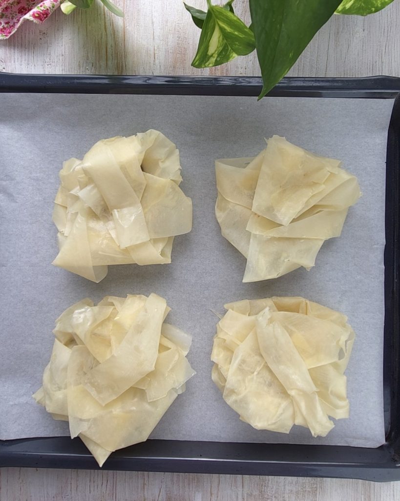Sie lassen sich bis zu 3 Tage unter einer Kuchenglocke aufbewahren. Filoteig ist sehr dünn und kann beim Falten leicht reißen; ich empfehle, ihn auf ein feuchtes Tuch zu legen. Falls ein Blatt doch reißt, könnt ihr zwei leicht gebutterte Blätter übereinanderlegen und so weitermachen. Ihr könnt den Filoteig auch mit Öl statt Butter bestreichen.