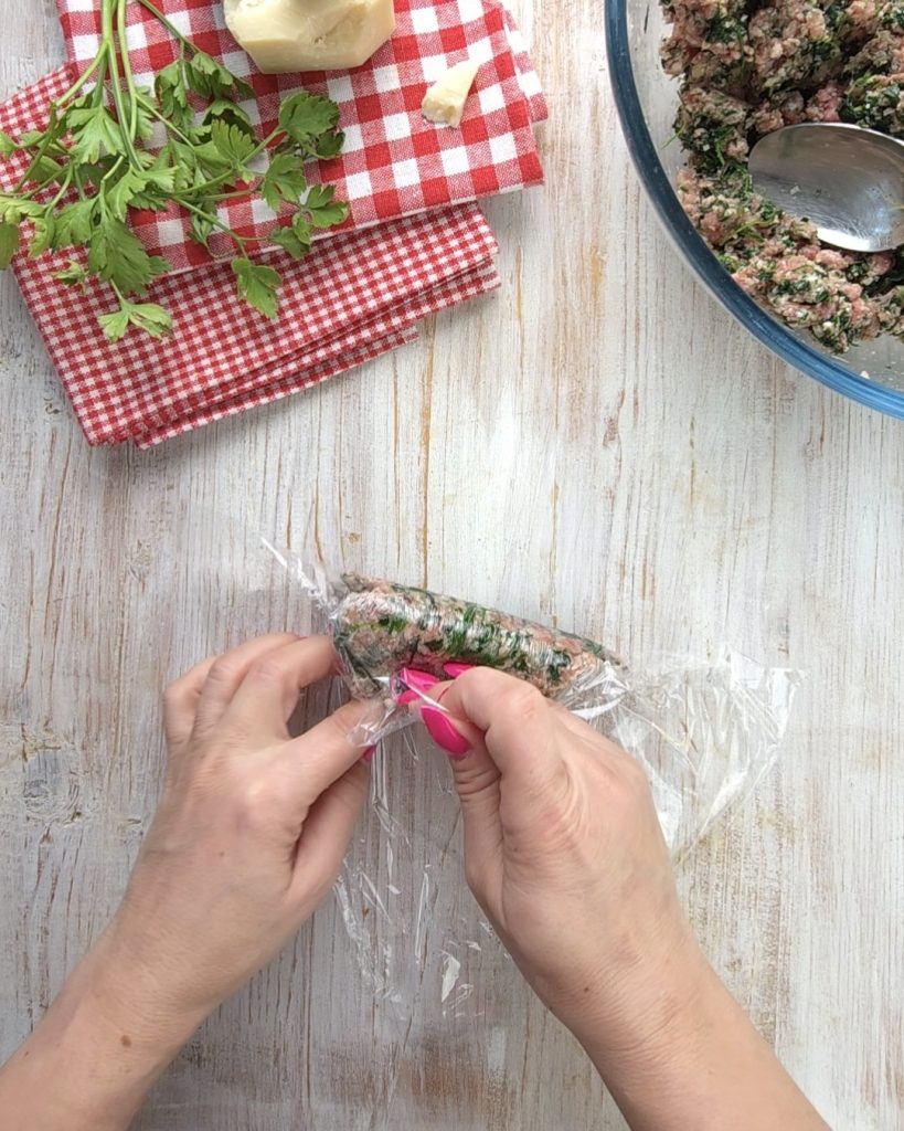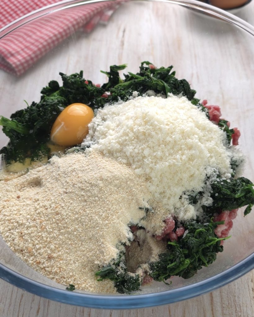 • Gebt in eine große Schüssel das Rinderhackfleisch, das Ei, den Parmigiano und das Salz; fügt außerdem den Spinat hinzu – gut ausgedrückt und mit dem Messer klein gehackt – sowie die restlichen Zutaten.
