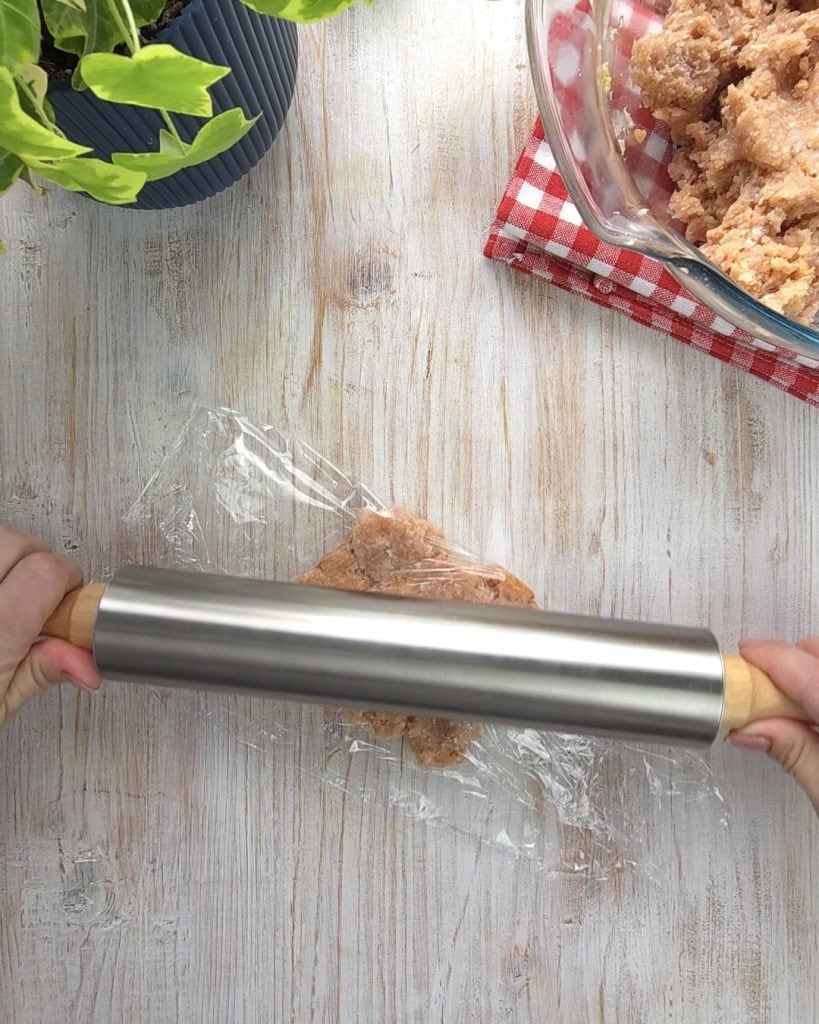 Wickeln Sie das Fleisch in Frischhaltefolie und drücken Sie es mit einem Nudelholz flach.