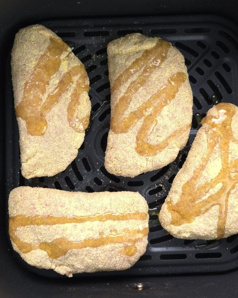 Nun backen Sie sie in der Luftfritteuse oder im Ofen mit etwas Öl darüber für etwa 15 Minuten bei 180°C oder bis zur goldbraunen Farbe.