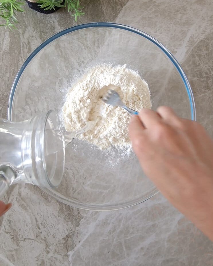 Geben Sie das Mehl, das Salz, das Wasser und das Öl in eine Schüssel.