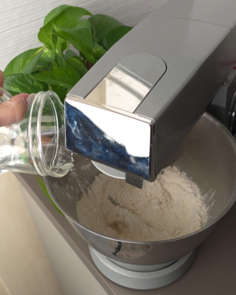 Gebt Mehl und Hefe in die Schüssel der Küchenmaschine, dann Wasser und Zucker dazu. Fügt das Öl hinzu und knetet nach und nach.