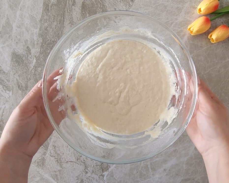 In einer großen Schüssel Hefe, Mehl und lauwarmes Wasser einfüllen,