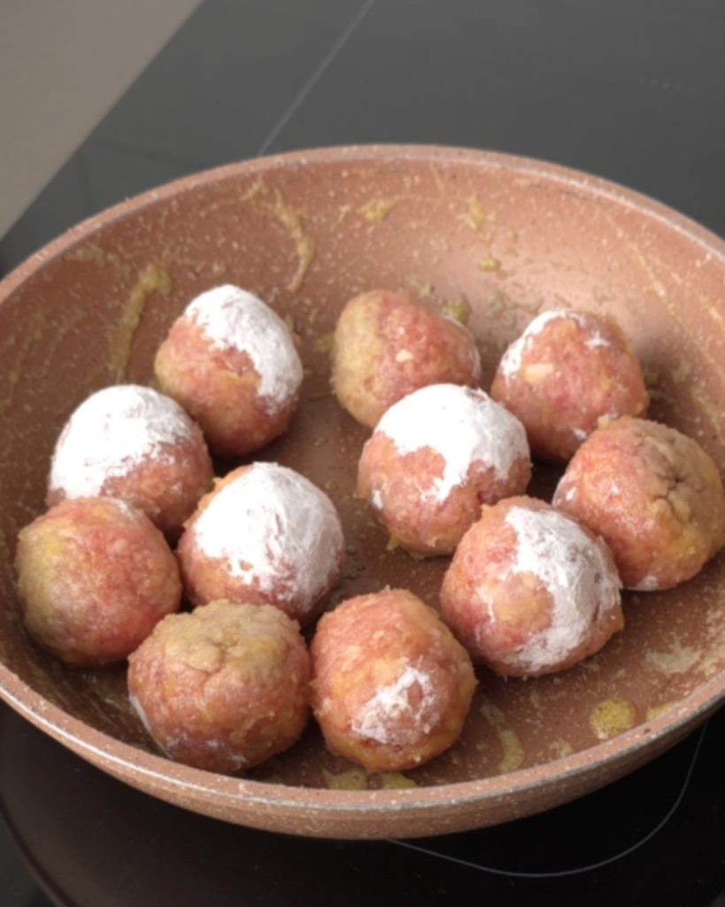 • Mit den Händen etwas Hackfleisch nehmen und Frikadellen formen, nicht zu groß, dann in Mehl wenden. In der Pfanne kochen, dann mit Wein ablöschen.