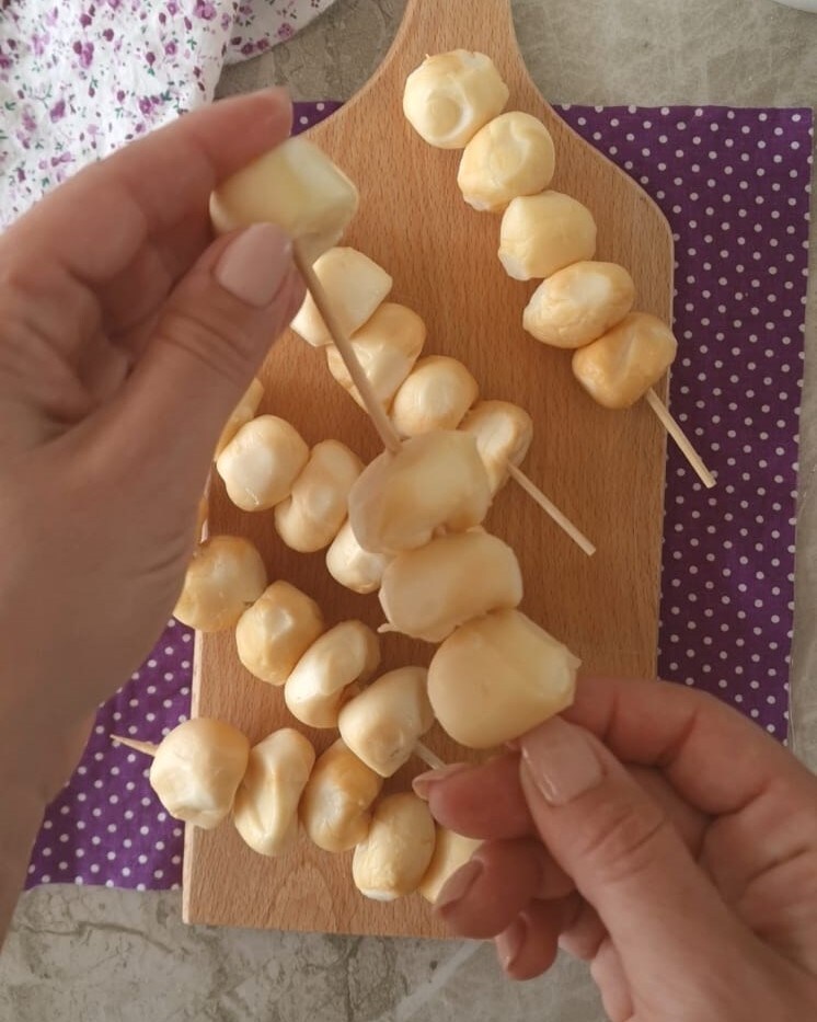 Beginnen Sie damit, die kleinen Scamorzas auf die Spießstäbchen zu stecken.
