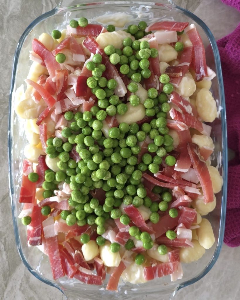 Gebackene Gnocchi mit Speck und Erbsen, sind ein fantastisches Hauptgericht, das Rezept ähnelt sehr den überbackenen Gnocchi mit Schinken. Selbstgemachte Gnocchi zuzubereiten ist nicht schwer, aber wenn Sie es eilig haben, können Sie auch eine fertige Packung nehmen. Geben Sie einfach alle Zutaten roh in eine Auflaufform und würzen Sie sie mit Béchamel und geriebenem Käse. Und Sie denken vielleicht, Sie haben das Rezept falsch gelesen, aber nein! Die Gnocchi müssen nicht gekocht werden. Wenn ich Sie neugierig gemacht habe, probieren Sie es so schnell wie möglich aus! Vergessen Sie nicht, mir auf meinen Instagram– und Facebook-Seiten zu folgen. Ich freue mich auf Sie!