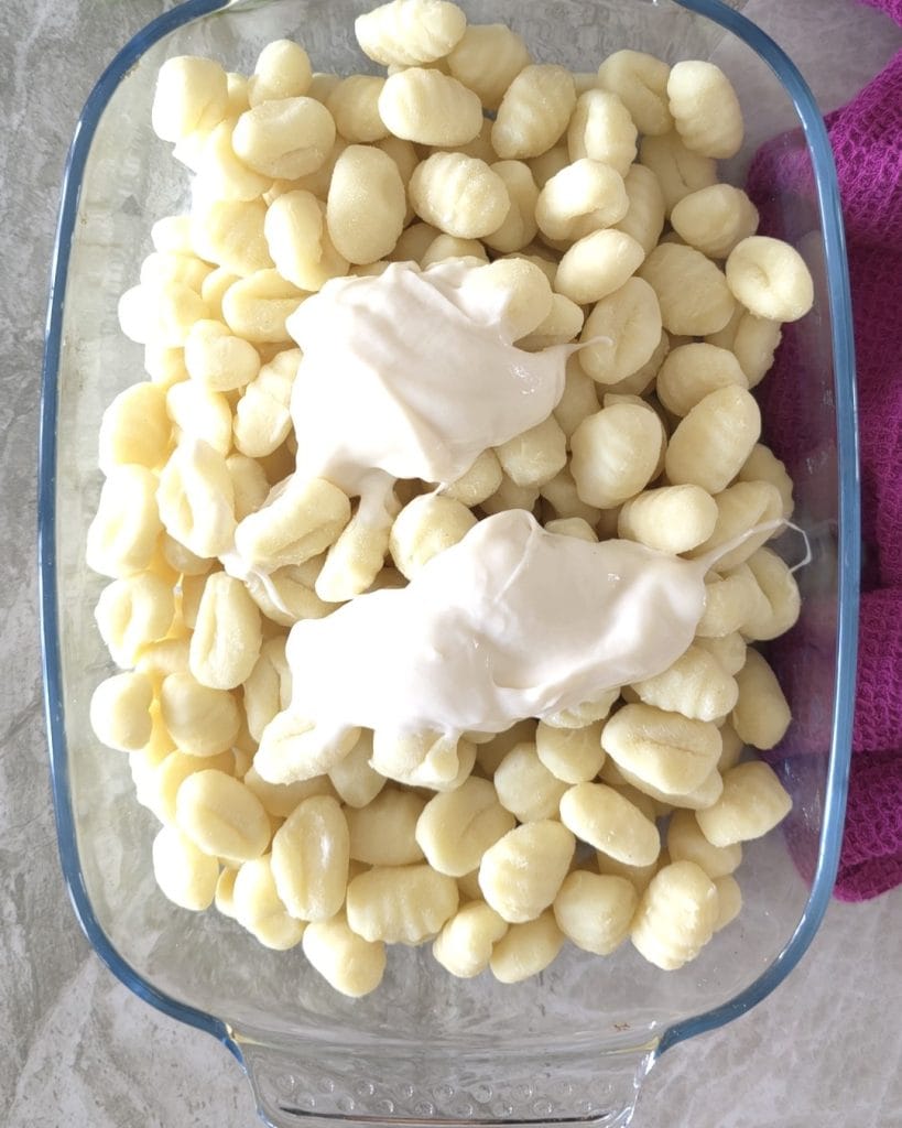 Öffnen Sie eine Packung Gnocchi und legen Sie diese in eine Auflaufform.