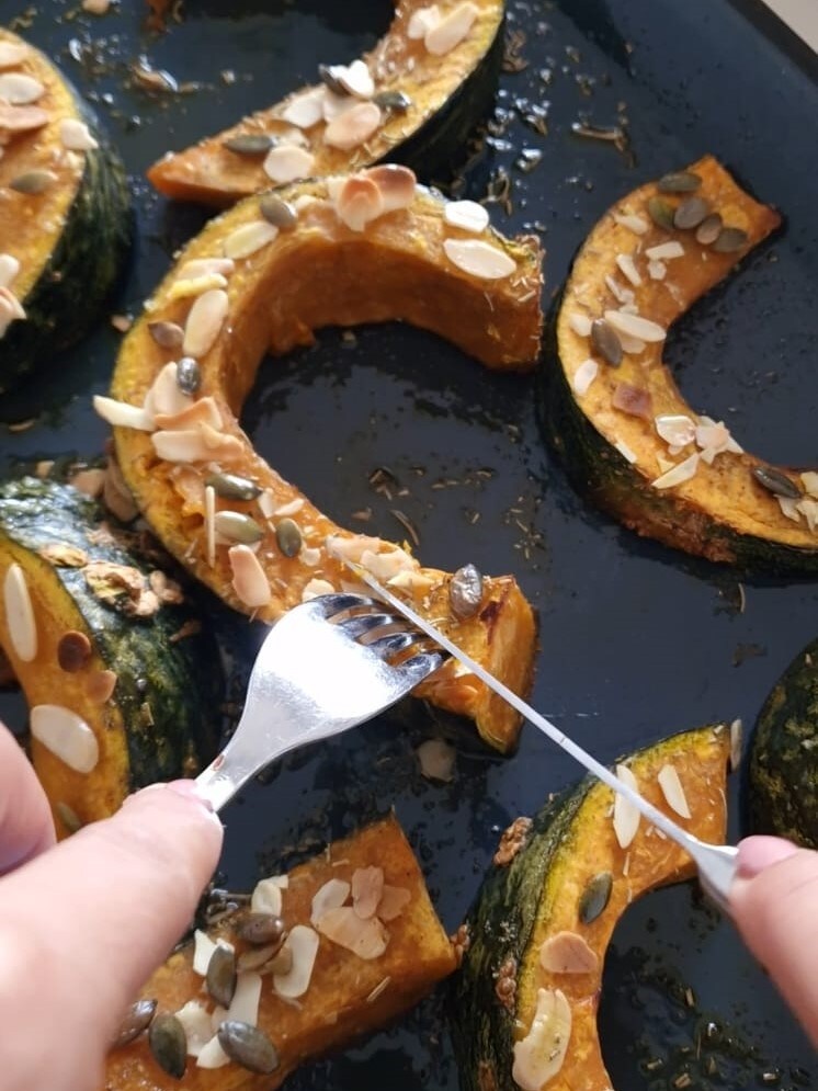 Backt bei 180°C im statischen Ofen etwa 40 Minuten oder bis der Kürbis weich ist.