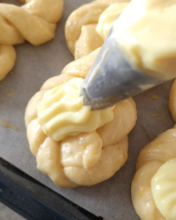 Bestreichen Sie mit dem leicht geschlagenen Eigelb mit Milch und füllen Sie mit Vanillecreme, dann im statischen Modus bei 180°C für etwa 15-20 Minuten backen.