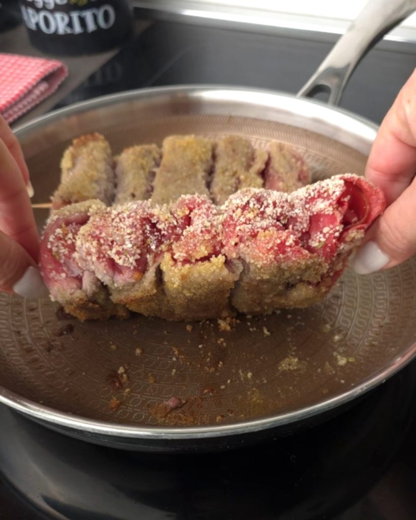 Man nimmt dünne Fleischscheiben und paniert sie; dann fülle ich sie mit dem, was ich am meisten liebe: schmelzender Käse und Speck. Es genügt, alles sorgfältig zu rollen und die Rouladen auf Spieße zu stecken.