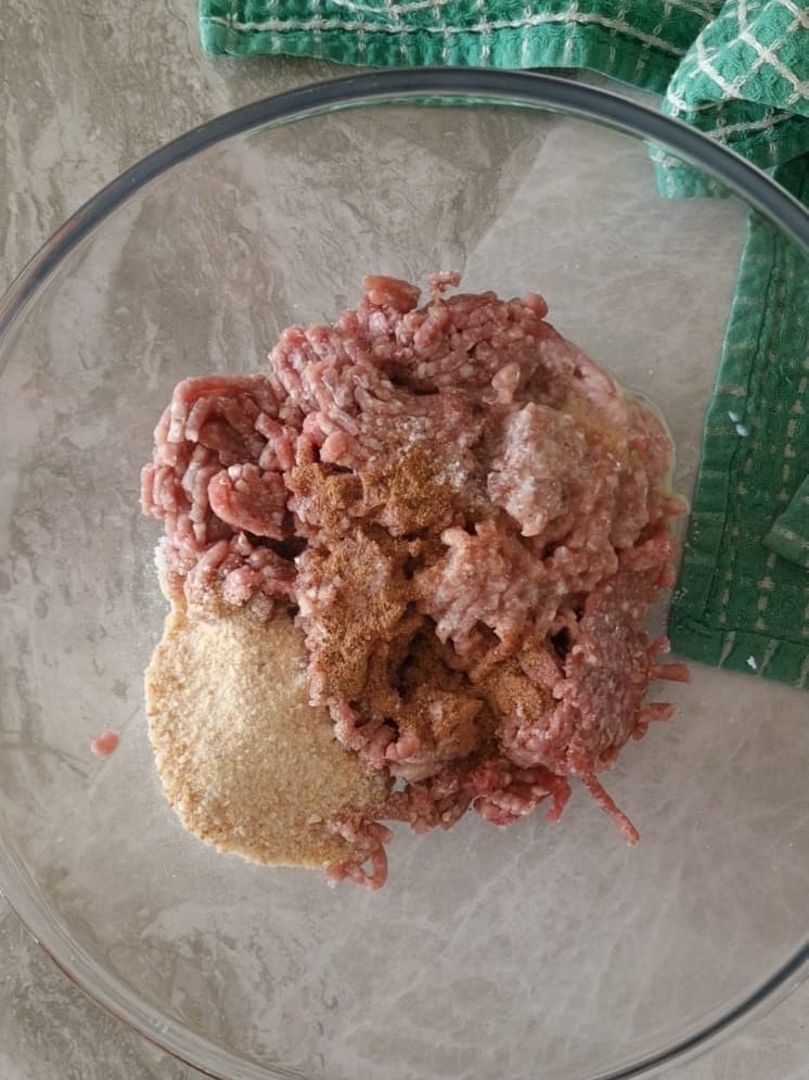 In einer großen Schüssel das Hackfleisch, Salz, Pfeffer, Knoblauch, Paniermehl, Ei und geriebenen Parmesan geben.