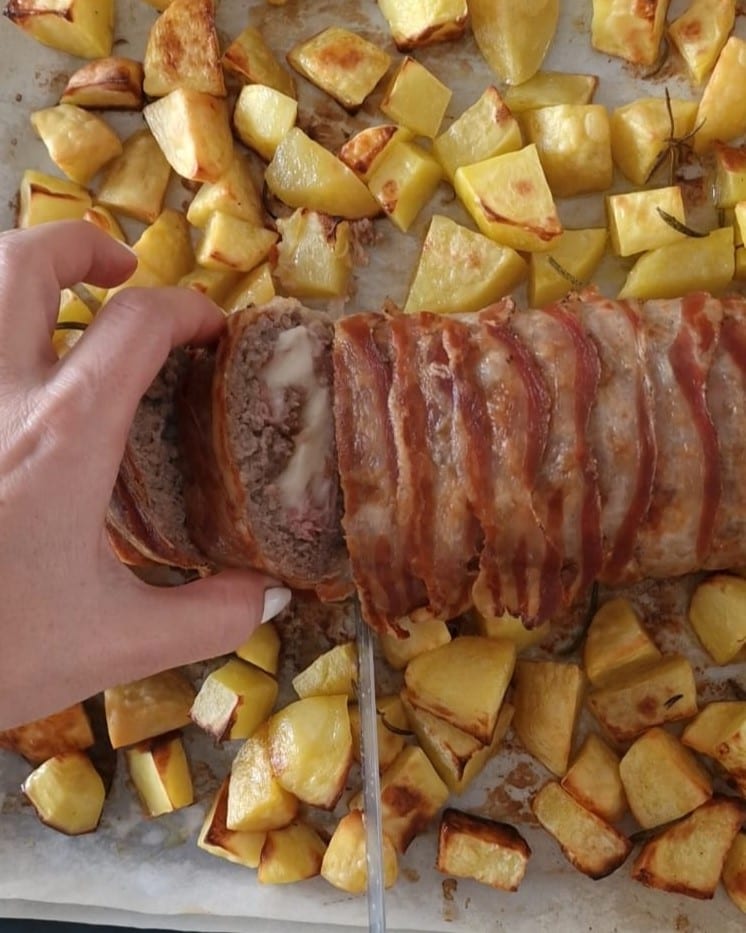 Backen Sie den gefüllten Hackbraten mit den Kartoffeln für 40-45 Minuten bei 180°C. Servieren Sie den Hackbraten in Scheiben, wenn er noch schön heiß ist!