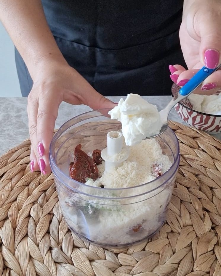 Zuallererst kümmern Sie sich um das Pesto auf diese Weise: Legen Sie die getrockneten Tomaten in einen Mixer, zusammen mit den Pinienkernen, der Ricotta, dem Basilikum und dem extra nativen Olivenöl.