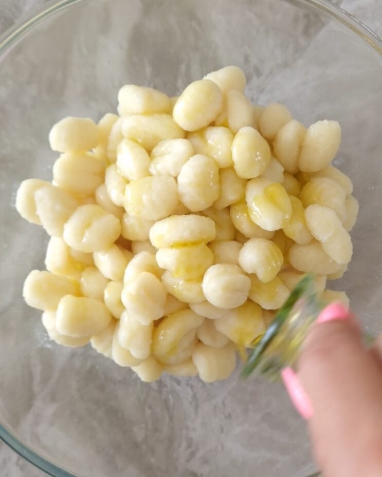 Abgießen und in eine Schüssel geben, indem Sie etwas Olivenöl darüber gießen und mischen, formen Sie nun die Spieße mit den Gnocchi, indem Sie die Gnocchi auf den Holzspieß stecken.
