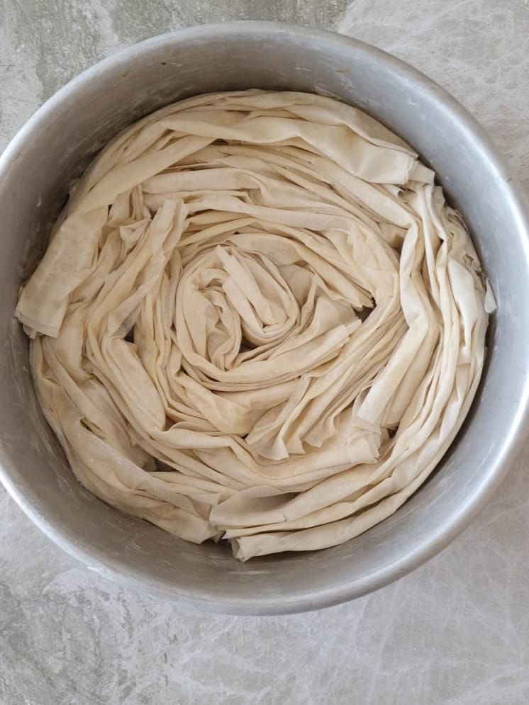 Filoteig wird vom griechischen „phyllo“ abgeleitet, was „Blatt“ bedeutet. Er besteht hauptsächlich aus Mehl, Wasser, Öl und einer Prise Salz, der Teig wird zubereitet und 2 Stunden ruhen gelassen, dann in gleiche Teile geteilt, die mit einem Nudelholz ausgerollt werden.