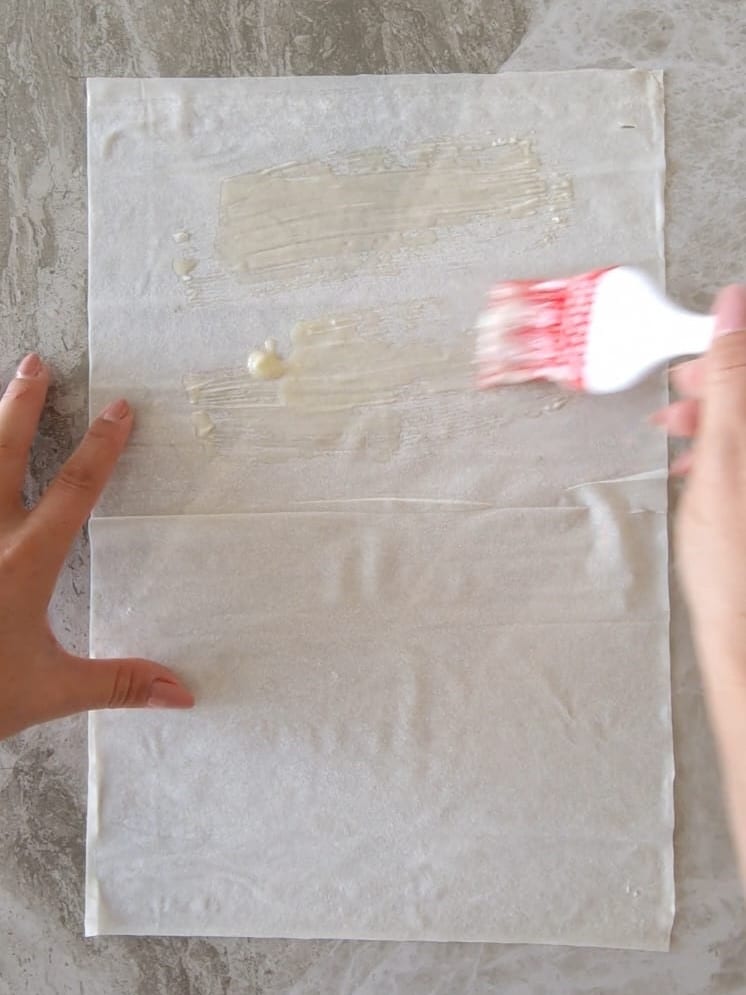 Den ersten Filoteigblatt nehmen und dann mit geschmolzener Butter bestreichen.