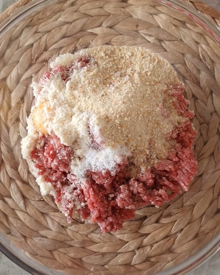 In einer großen Schüssel das Hackfleisch, das Ei, das Salz, das Paniermehl und den geriebenen Parmesan geben.