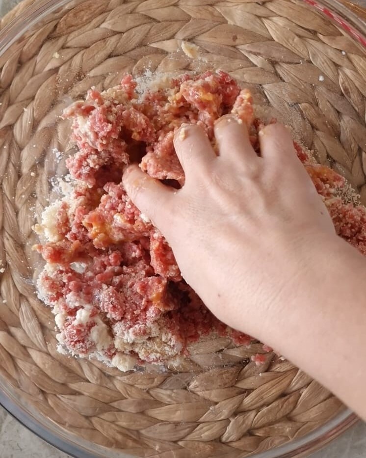 Dann mit den Händen alles gut vermengen, bis eine gut vermischte Masse entsteht.