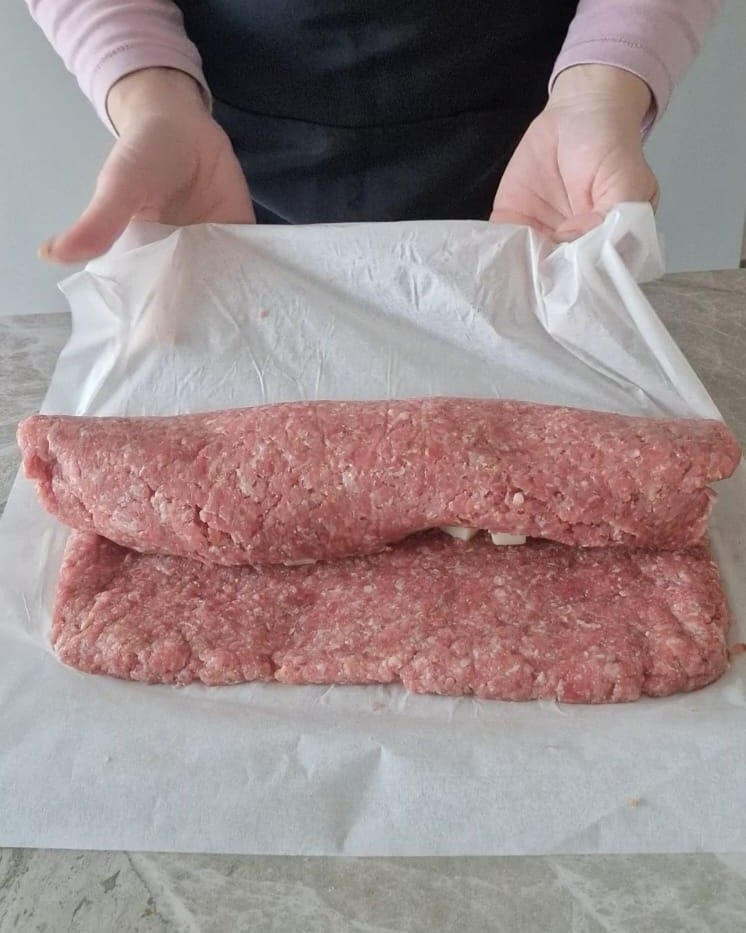 Dann das Fleisch zwischen zwei Backpapierblätter ausrollen und mit einem Nudelholz ein Rechteck formen.