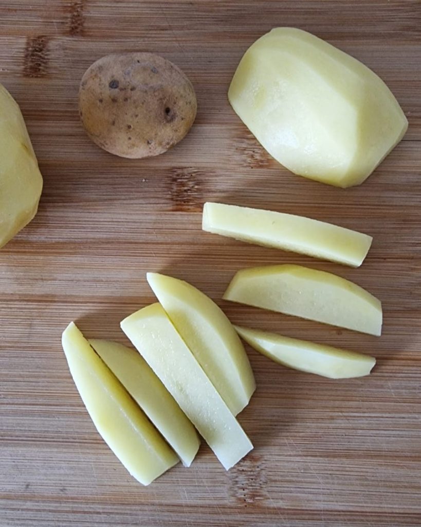 Sobald das Fleisch gekocht ist, legen Sie es in eine Auflaufform mit dem Bratensatz, decken Sie es dann mit einem Alufolienblatt ab, um zu verhindern, dass es austrocknet. Inzwischen schälen Sie die Kartoffeln und schneiden Sie sie in Stücke von etwa 4 cm.