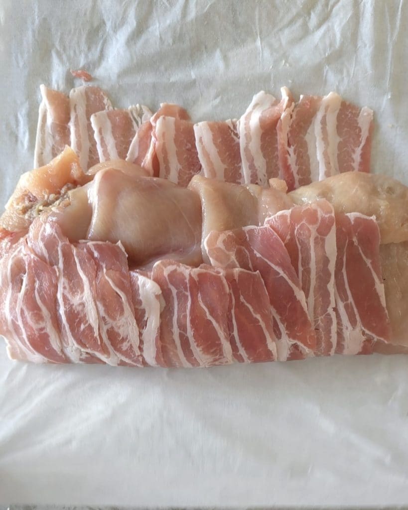 Nun rollen Sie das Fleisch sehr vorsichtig zu einer Rolle auf. Als letzten Schritt umwickeln Sie den Rollbraten mit Bacon.