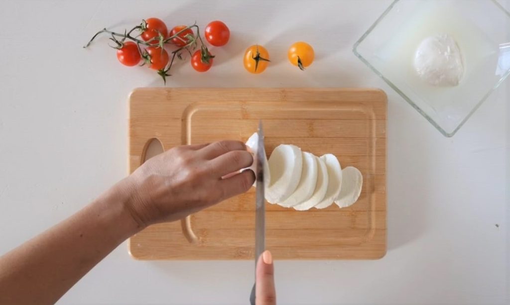 • Auf einem Schneidebrett die Kirschtomaten halbieren, dann auch den Mozzarella schneiden und beiseite stellen.