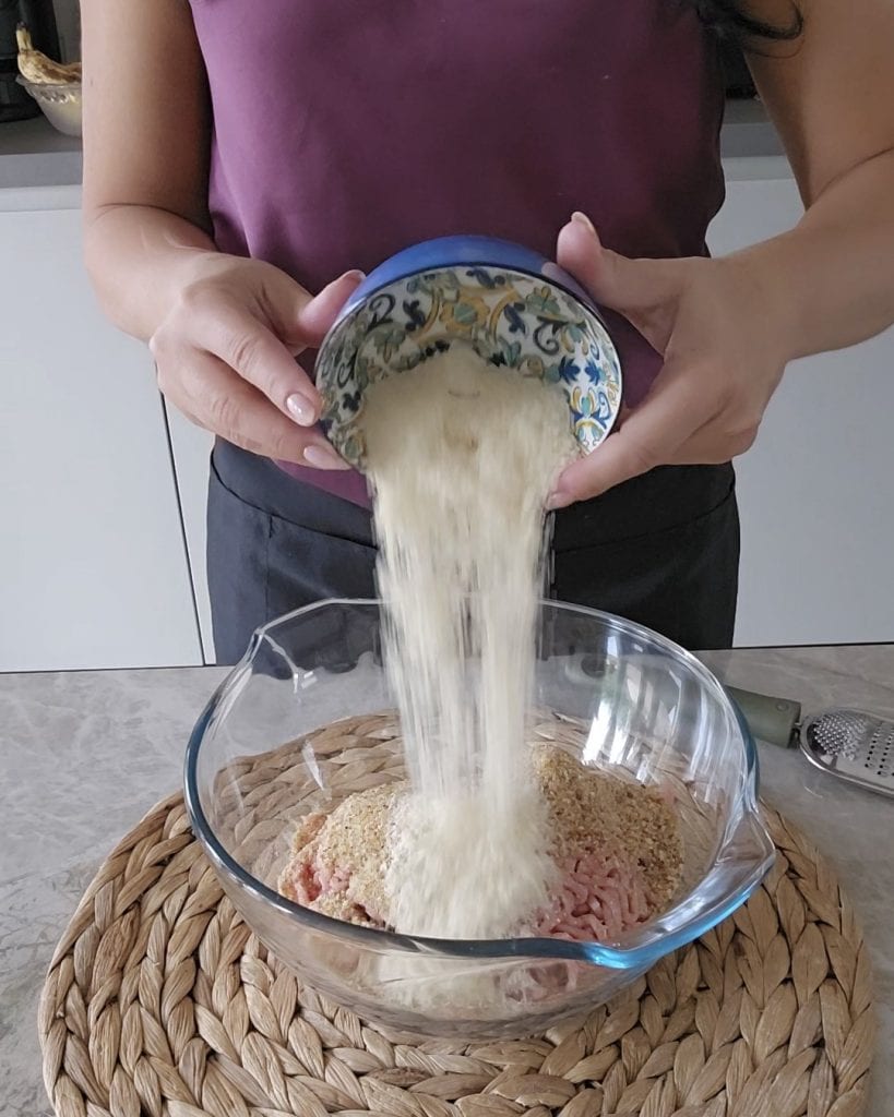 In eine große Schüssel geben Sie das gehackte Fleisch, das Ei, das Salz, den Parmesan, die Semmelbrösel, die Milch und etwas Zitronenschale.