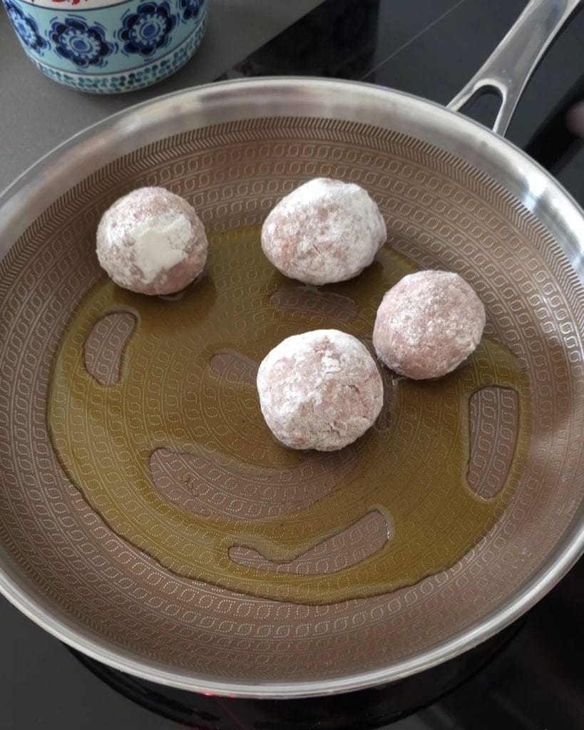 Nehmen Sie eine kleine Menge Fleisch und formen Sie viele kleine Frikadellen, indem Sie sie mit den Händen rollen. Dann in Mehl wenden.