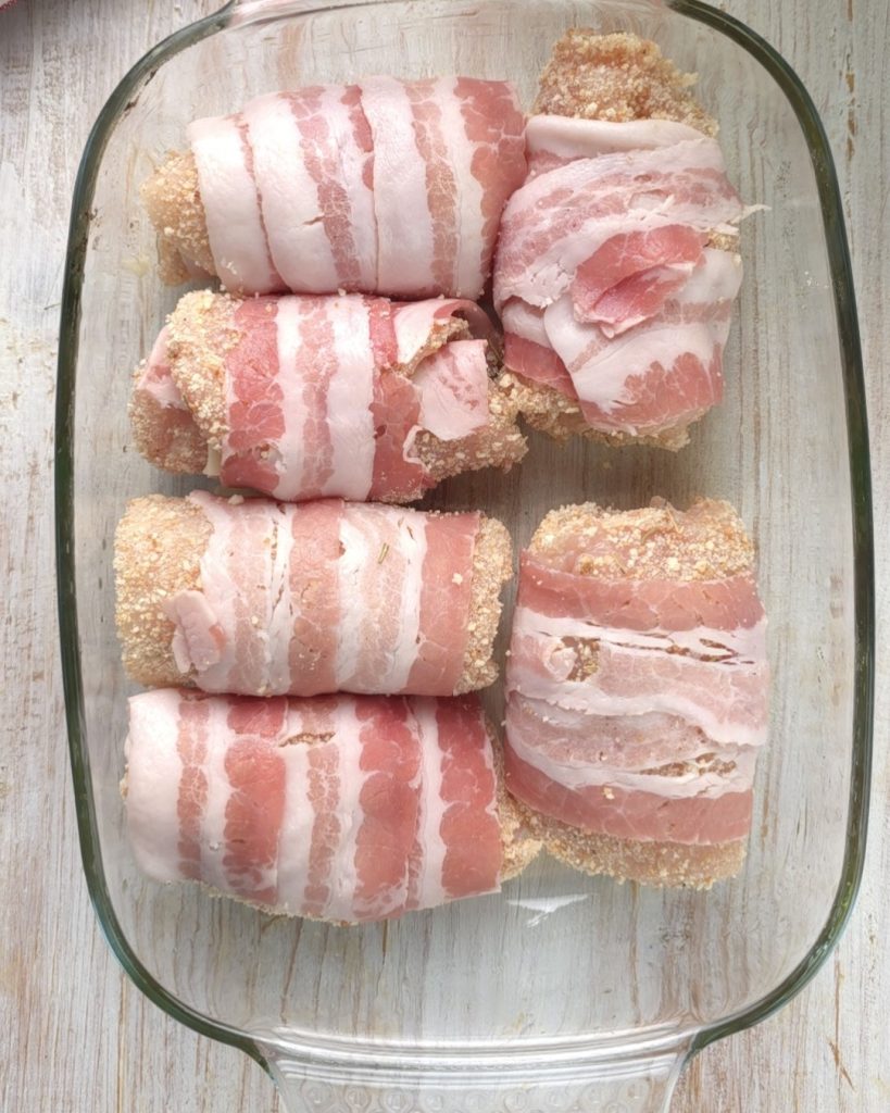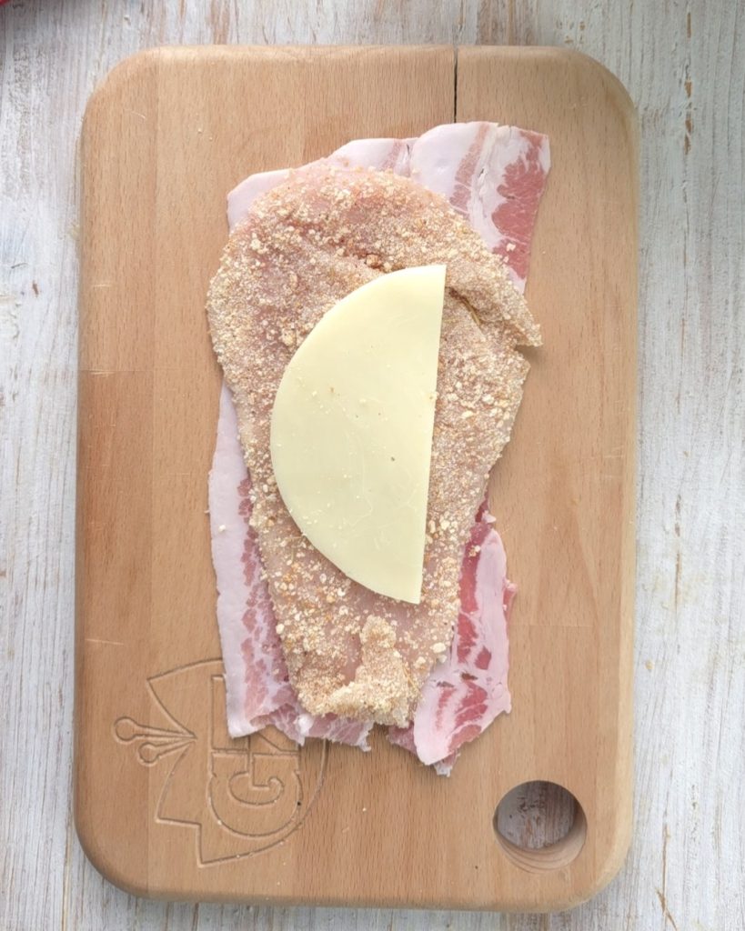 Legen Sie auf einem Schneidebrett Speckscheiben, eine Scheibe paniertes Hähnchenbrustfilet und eine Scheibe Käse und rollen Sie dann auf.