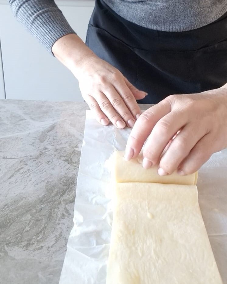 Auf der Arbeitsfläche rollen Sie den rechteckigen Blätterteig aus und dann teilen Sie ihn in 3 vertikale Teile.