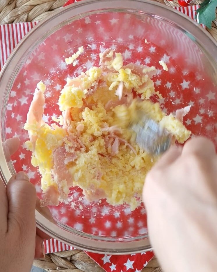 Beginnen Sie damit, die Kartoffeln zu kochen, dann zerdrücken Sie sie in einer Schüssel und würzen Sie sie mit Salz und fügen Sie den gekochten Schinken hinzu.