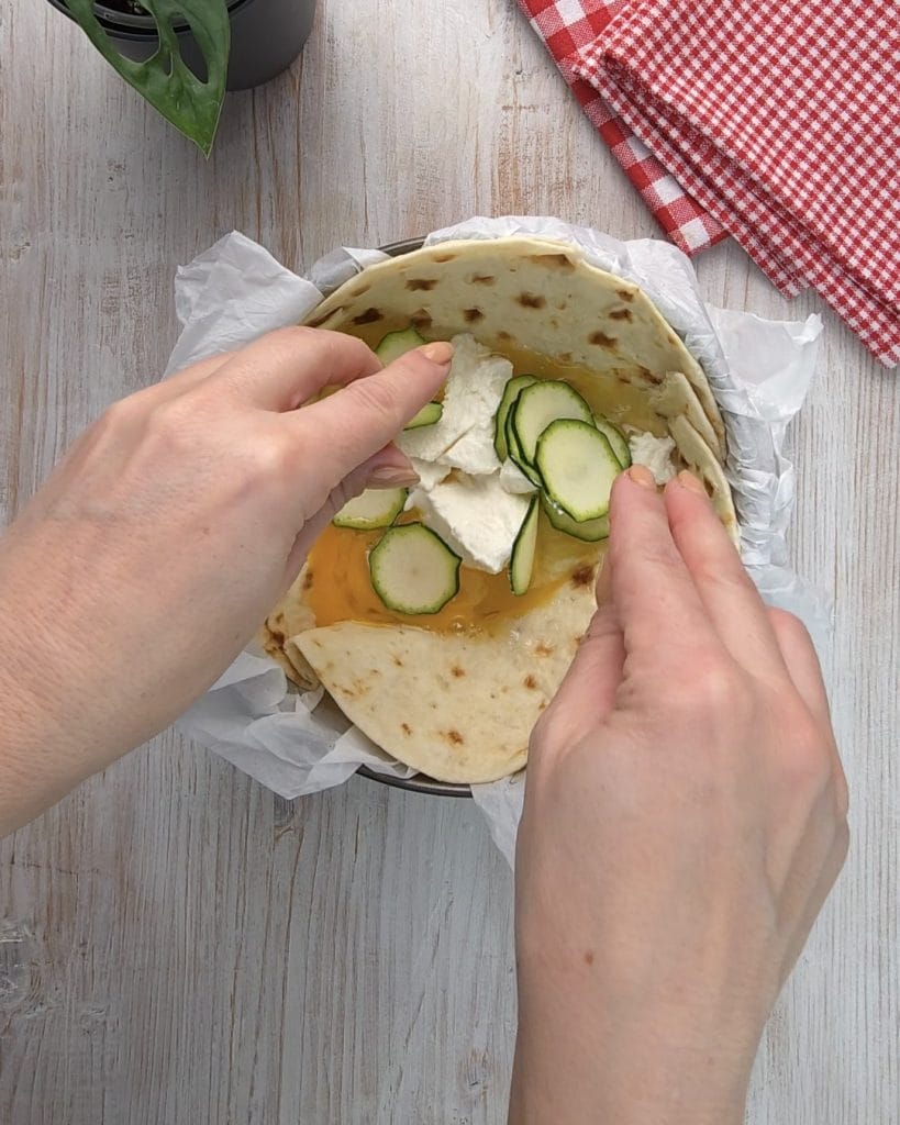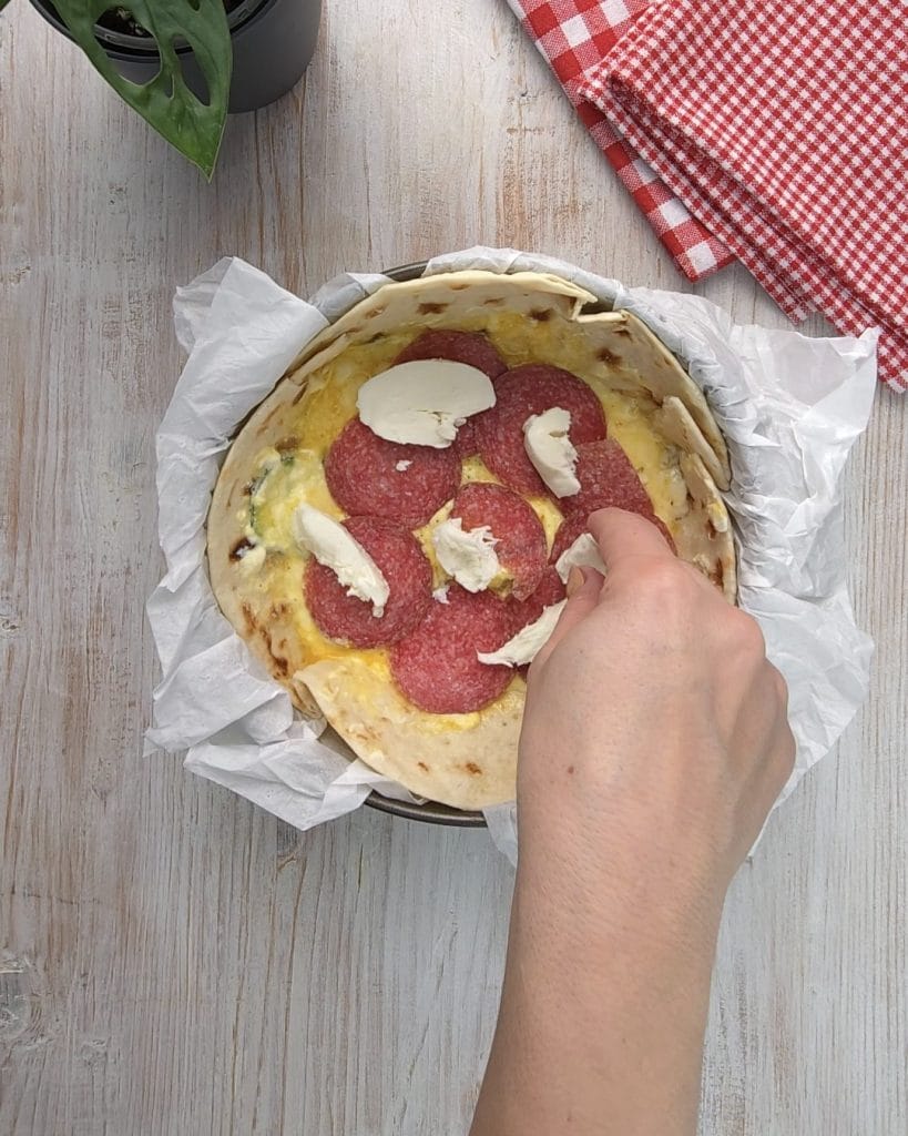 Legt die Piadina in die Form und lasst die Ränder hoch (falls nötig, schneidet kleine Einschnitte an den Seiten, damit die Piadina besser an den Wänden haftet).