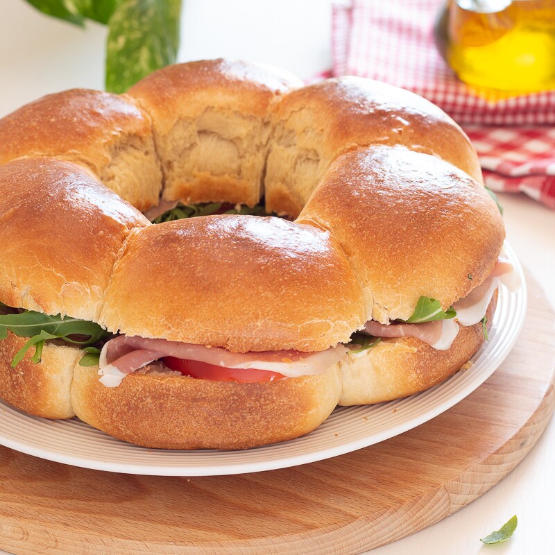 Er kann unter einer Kuchenhaube oder in einem Lebensmittelbeutel aufbewahrt werden. Sie können den herzhaften Brioche mit Salami und Käse füllen oder mit Mortadella und Pistazien oder mit Thunfisch und Mayonnaise. Für eine vegetarische Variante können Sie ihn mit Mozzarella und Tomaten oder gegrilltem Zucchini, Auberginen und Paprika füllen.