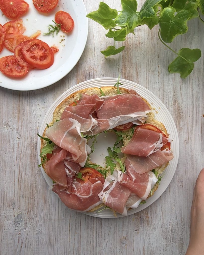 Sobald er abgekühlt ist, schneiden Sie ihn in der Mitte durch und füllen Sie ihn mit ein paar Teelöffeln Mayonnaise, Rucola, Tomaten mit Salz und Oregano und rohem Schinken.