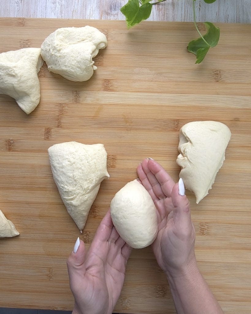 Nach der Ruhezeit teilen Sie den Teig in 6 gleiche Teile.
