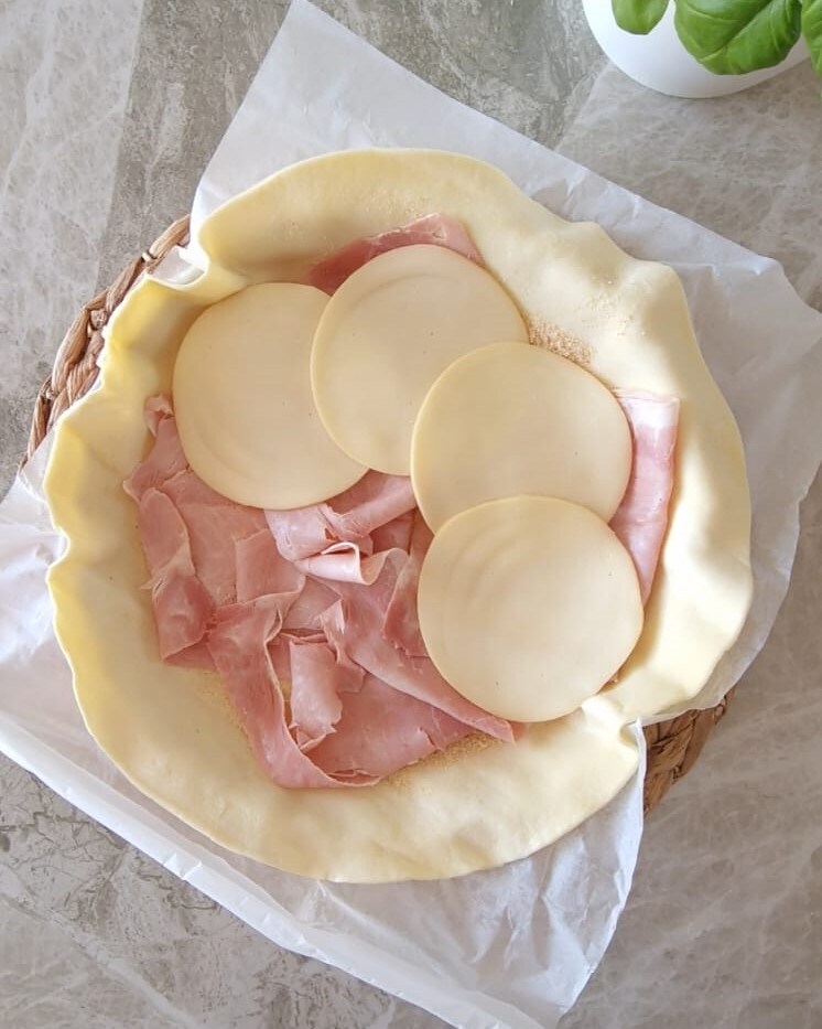 Befüllen Sie ihn zuerst mit dem gekochten Schinken und legen Sie die Käsescheiben darauf; klappen Sie dann die Ränder des Kuchens um und formen Sie eine Kordel.