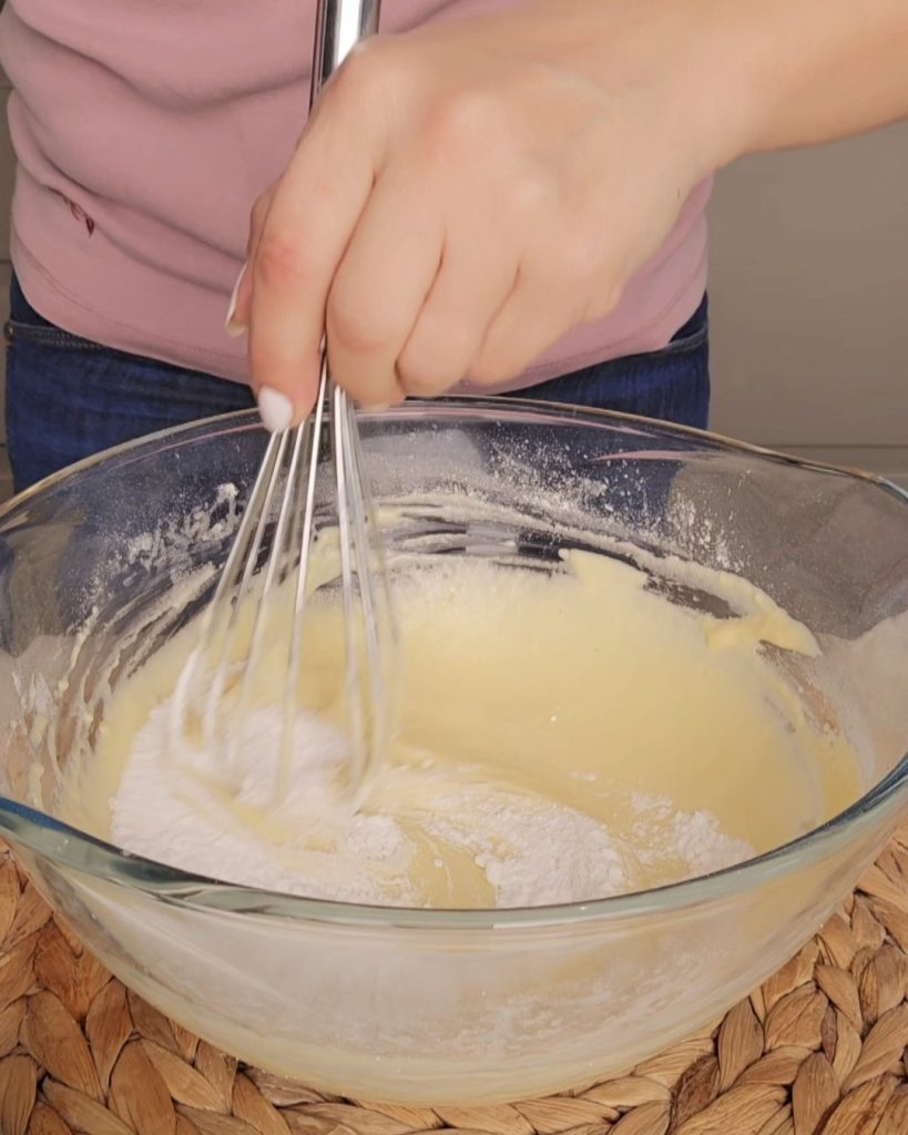 Schlagen Sie in einer großen Schüssel die Eier auf, dann geben Sie Milch und Öl hinzu und vermischen Sie alle flüssigen Zutaten gut.